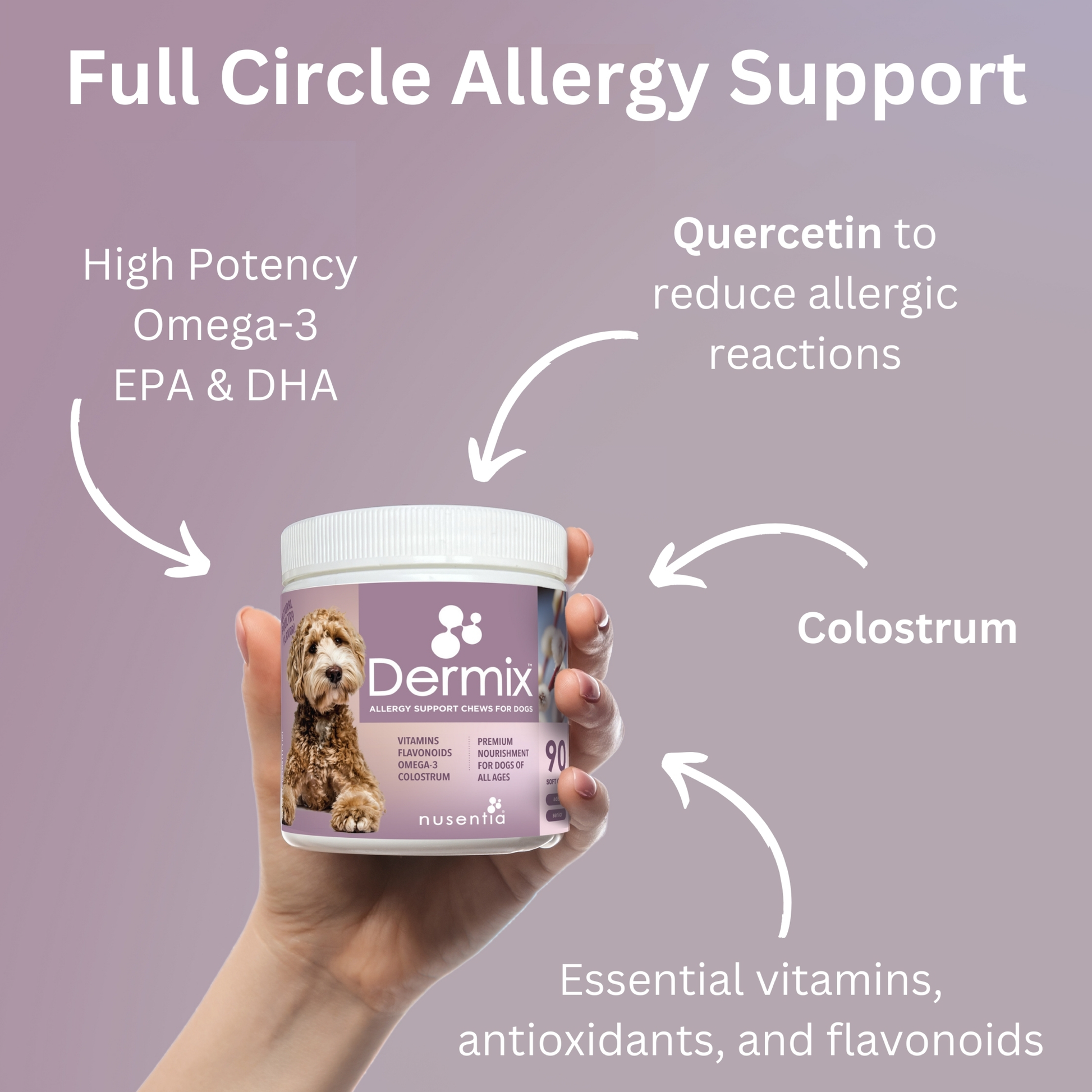 Unlike many other supplements, Dermix™ Allergy Chews are crafted with a blend of scientifically backed ingredients like colostrum, omega-3 fatty acids, and a robust vitamin complex. This unique formula not only tackles allergies but also supports a broad range of health benefits, making them a comprehensive health solution for your pet. Plus, they're delicious, which ensures easy administration.